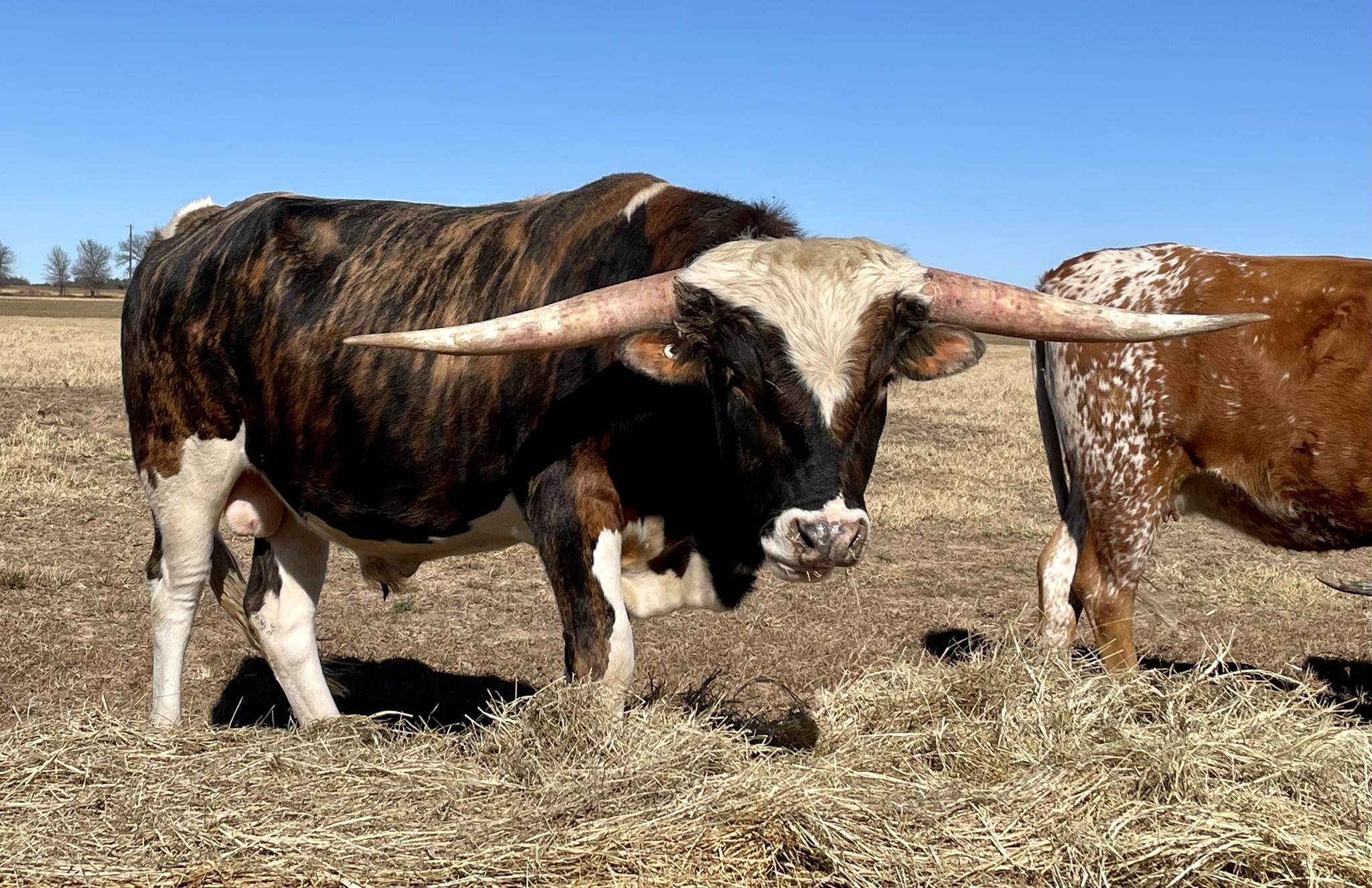 STRIKING BRINDLE WITH WHITE. VERY THICK LONG BODIED. EXCELLENT HORN DIRECTION AND LENGTH.