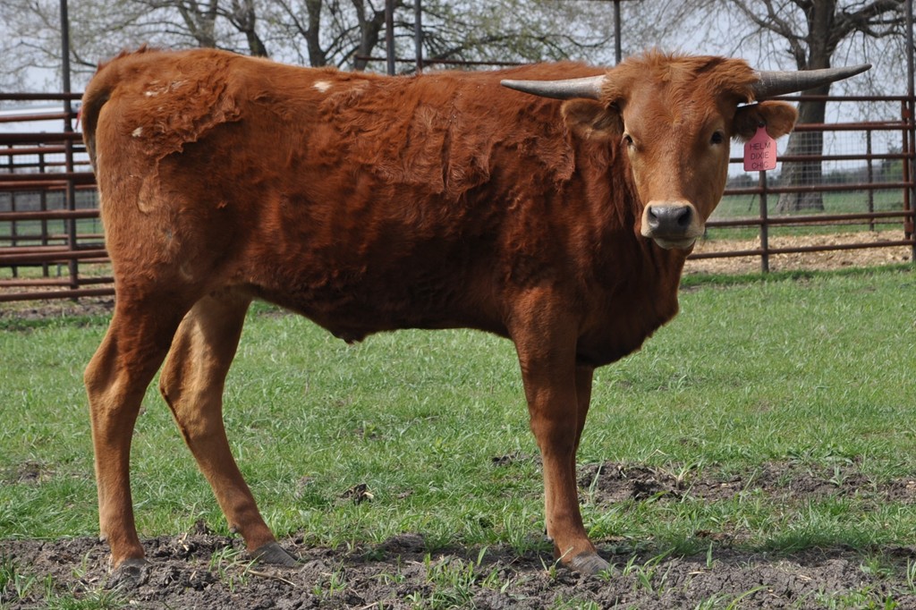 Great Producer bred by the Gentleman Breeder Joe Valentine. This wonderful cow has been a steady producer for us, calving like clock work and she has more than earned her keep for she has brought in more that $50,000 in the sale of her progeny alone over the years. Her beautiful Dam "PC Miss Dixie Classic" was one of the first cows that we ever sold as a cash cow, she brought $11,250 and was sold at the 2011 Midwest Sale to Red McCombs. She goes back to the "Jaynie 698" Cow that has given a ton of Awesome Offspring to Bill Hudson and Joe and Lorinda Valentine. "Dixie Chic's" other high selling offspring is "Helm Dixie Gal" sold for $10,000 at the McCombs Sale; "Helm Dixie Cowgirl" sold at the Legacy for $20,000 plus; "Helm Jayne 611" $$$$$$ private treaty; "Helm Adidas" sold as a herdsire private treaty; "Scattergun" sold as a herdsire private treaty; "Helm Fancy" sold private treaty; "Helm Classic Chic 182" sold private treaty, "Pump Action" sold as a herdsire and others as well. "Dixie Chic" has never had a sick day in her life while giving us a calf every year of her breeding life. She is still a great milker with great udder. She has a wonderful low lateral twisty horn set that measured very near 87" ttt on 4/02/22. Just an all around great cow in every way. In 2022 gave us a very healthy colorful and complete bull by "Brazos Tuff Cowboy 901". In 2023 Dixie Chic gave a a beautiful heifer by “Cherokee HR”. She Keeps on Keepin on !