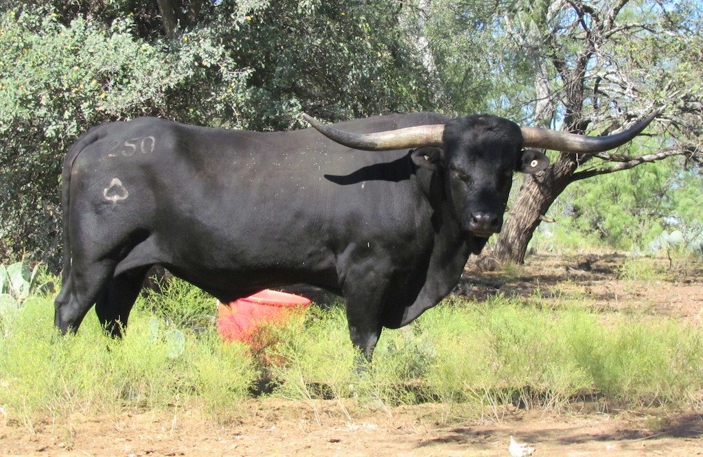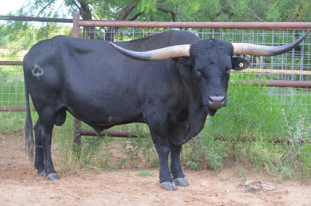 A sleek, long-bodied, true black son of Texas Longhorn royalty. In Colorado Texa’s pedigree, the 3-time TLMA Ultimate Bull JP Rio Grande meets Texana Van Horne, a full sister of Tejas Star. Both parents and great-grand-dam Starlight are over 80” TTT. Texa's horns are both tipped, but his outstanding horn genetics are clear in his progeny.