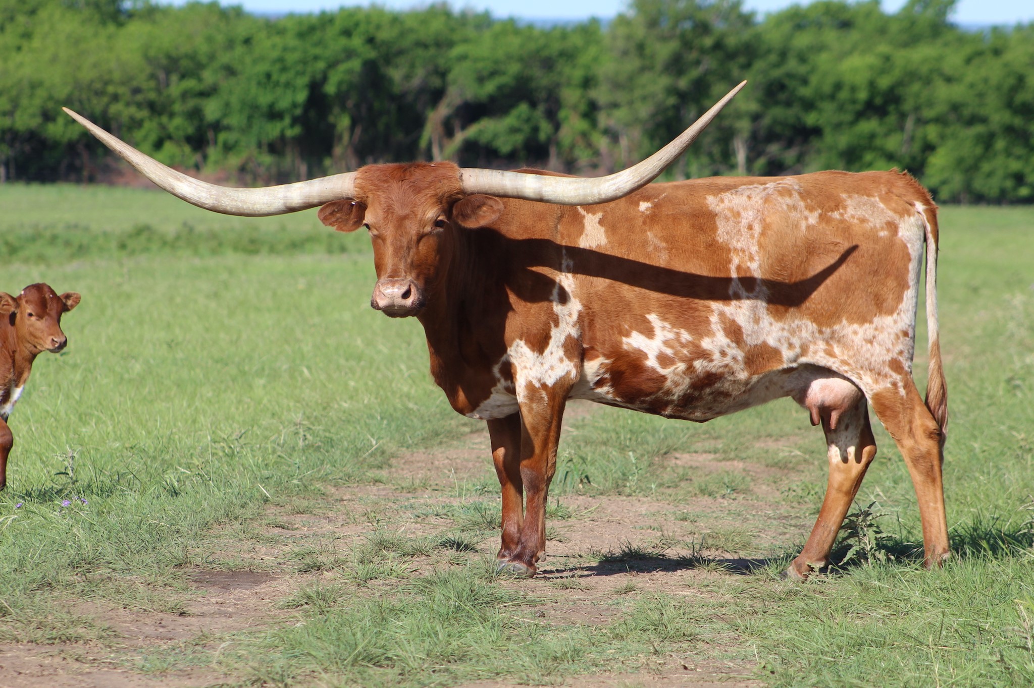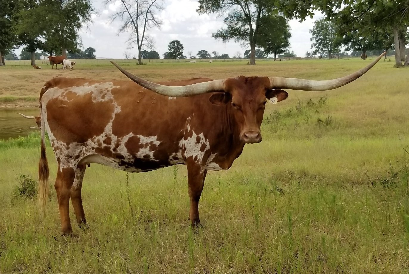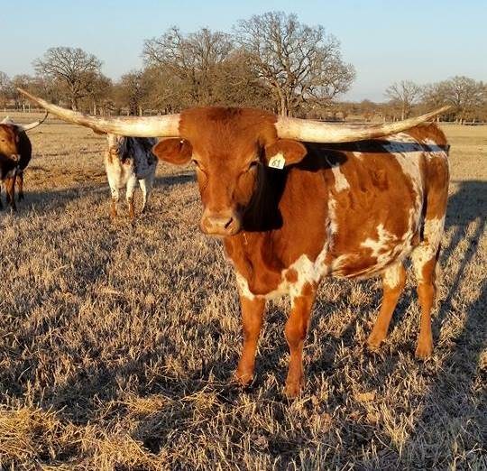 Cowgirl is big Loomis bred cow! We are so fortunate to have her in our herd. She has horns, color and disposition! She is a great producer with knock out genetics She is the dam of our Herd Sire, Red River Firestorm. She has such nice mother instinct to raise a good calf each hear.