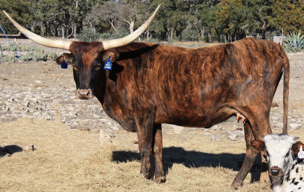 Sparky, a big brindle cow that throws fantastic colorful calves, is a Maximus ST daughter. A milking machine, she is sweet and easy going and passes her friendly inquisitive disposition to her big fat calves.